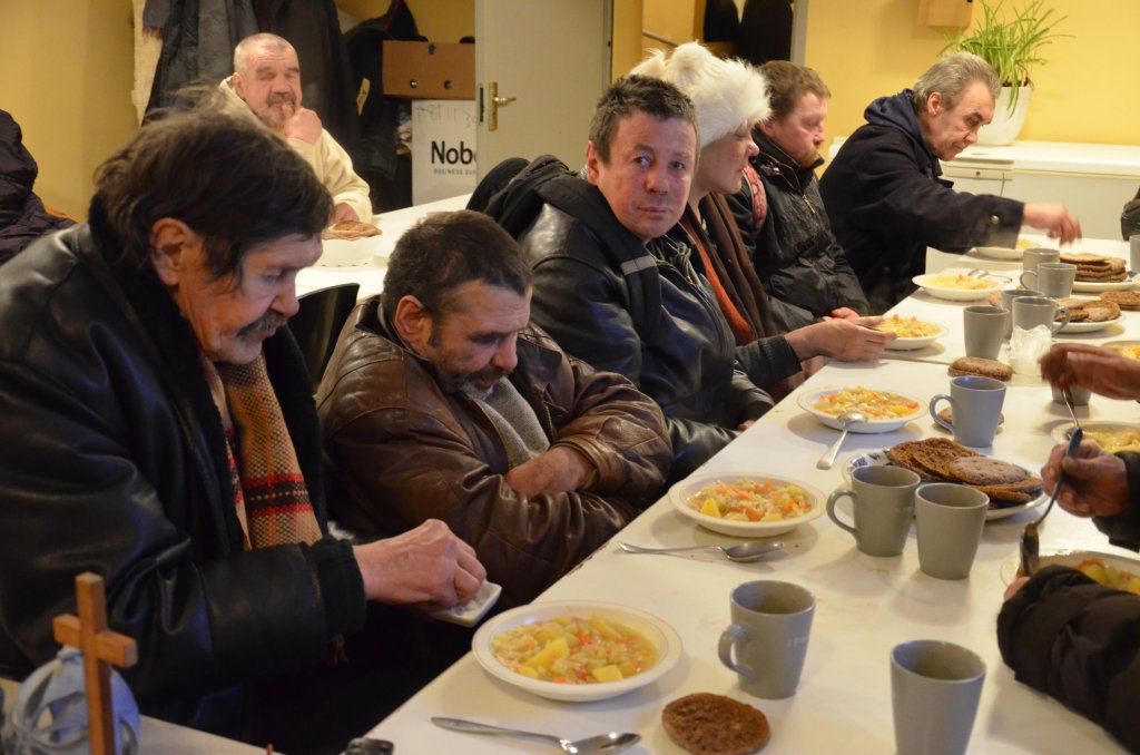 I lokalen i kyrkans källarvåning erbjuds varje dag gemenskap och värme. Här serveras alla ett mål varm lagad mat. Det finns möjlighet att duscha och få rena kläder.